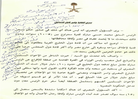 وتضمنت الوثيقة التي حملت عنوان "سري للغاية وغير قابل للتداول" أقوالًا منسوبة لمسؤول مصري، قبل صدور الحكم على مبارك في المحاكمة الأولى، من بينها أنه متأكد من أن قادة دول الخليج العربية يتطلعون إلى تقديم فدية لإطلاق سراحه (مبارك) وسفره إلى خارج مصر، وأن أكثر قادة دول المجلس حرصًا على ذلك هو خادم الحرمين الشريفين.