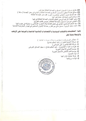 ومن أبرز من أعلنت عنهم اللجنة: عبد الرحمن السويحلي، رئيس المجلس الأعلى للدولة بطرابلس، محمد صوان رئيس حزب العدالة والبناء الإخواني، بشير الكبتي مراقب الإخوان المسلمين بليبيا، طارق المقريف نائب محافظ ليبيا المركزي بطرابلس، عوض البرعصي نائب رئيس وزراء حكومة علي زيدان عام 2012.، خالد الشريف نائب وزير دفاع حكومة زيدان، بالإضافة لعدد من أعضاء المؤتمر الوطني السابق البارزين كقيادات وأعضاء بالجماعة الليبية المقاتلة وتنظيم الإخوان المسلمين المقيمين في قطر حالياً، ويتولون تمويل الجماعات الإرهابية في البلاد وتسهيل توصيل الدعم العسكري لها.