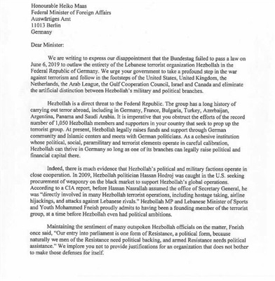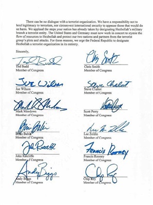 الطلب جاء مرفقا بخطاب حصلت "بوابة الحركات الإسلامية" علي نسخه منه، وفيه يعرب نواب الكونجرس عن خيبة أملهم من فشل البرلمان الألماني في تسجيل حزب الله كمنظمة إرهابية، رغم كل التهديدات التي يقوم بها، والممارسات المحظورة، مع الإشارة إلي الجرائم التي قام بها الحزب في عدد من دول العالم، وخاصة ألمانيا وفرنسا وبلغاريا وتركيا وأذربيجان والأرجنتين وبنما والسعودية.