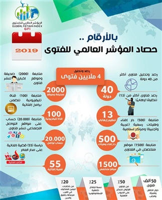 كشف المؤشر العالمي للفتوى (GFI) التابع لدار الإفتاء المصرية والأمانة العامة لدور وهيئات الإفتاء في العالم عن حصاده لعام 2019، مشيرًا إلى أنه قام بالرصد الآلي لنحو 4 ملايين فتوى في أكثر من 40 دولة حول العالم، وكذلك تفنيد الخطاب الإفتائي لأكثر من 13 تنظيمًا إرهابيًّا فاعلًا. وتوصل المؤشر إلى أن مصر والسعودية والأردن كانت أكثر الدول إصدارًا للفتاوى الرسمية وغير الرسمية على مستوى العالم خلال العام 2019.