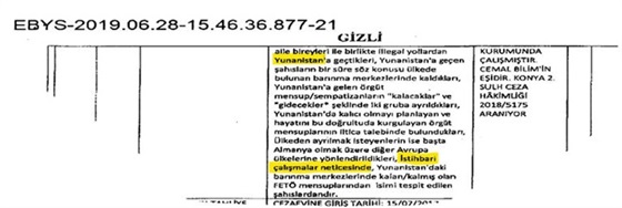 وأوضحت الوثيقة أنها "واحدة من أولئك الغولنيين (أتباع غولن) الذين تم تحديدهم على أنهم مكثوا في مراكز اللاجئين في اليونان"، وأن بعض الأعضاء ومتعاطفين مع حركة جولن عبروا بشكل غير قانوني إلى اليونان، مع بقاء بعضهم والتقدم بطلب لجوء هناك وآخرون ينتقلون إلى دول أوروبية أخرى خاصة ألمانيا.