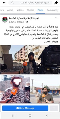 ووفق نفس الصفحة فإن القناة عملت أيضا على مواكبة العمليات العسكرية لميليشيات الوفاق المدعومة من تركيا في الوطية وطرابلس ويظهر من السياق أنها تؤيد عملية بركان الغضب التي أعلنتها حكومة الوفاق ضد الجيش الوطني الليبي.