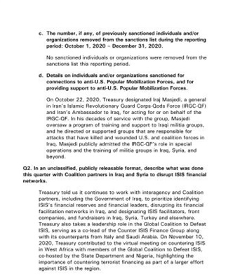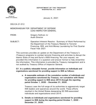 وأشار التقرير ، المؤرخ 4 يناير 2021، عن برامج وزارة الخزانة الأمريكية لمكافحة تمويل الإرهاب وأنشطة تعطيل تمويل داعش ، إلى أن الجماعة الإرهابية تواصل الاعتماد على "مراكز لوجستية" داخل تركيا في تمويلها.