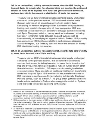 قال تقرير وزارة الخزانة الأمريكية: "استمر تنظيم داعش في استخدام شركات الخدمات المالية ، بما في ذلك الحوالات ، لنقل الأموال من وإلى العراق وسوريا ، وغالبًا ما يعتمد على المراكز اللوجستية في تركيا وفي مراكز مالية أخرى".