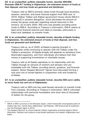 وبحسب التقرير ، استمر تنظيم الدولة الإسلامية في جمع الأموال من خلال ابتزاز شبكات تهريب النفط في شرق سوريا ، والخطف مقابل فدية ، والنهب ، وربما تشغيل شركات الواجهة. وقالت وزارة الخزانة: "استمر تنظيم الدولة الإسلامية أيضًا في استخدام شبكات البريد لتهريب الأموال بين العراق وسوريا". وشدد التقرير على أن داعش يمتلك على الأرجح ما يصل إلى 100 مليون دولار من الاحتياطيات النقدية المنتشرة في جميع أنحاء المنطقة.