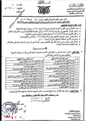 في إطار دأب ميليشيا الحوثي المدعومة من إيران على مساعي طمس الهوية اليمنية وتفكيك النسيج المجتمعي وحوثنة التعليم في اليمن، كشف قرار صادر عن مكتب التربية والتعليم بالمحافظة تغيير أسماء 12 مدرسة أساسية وثانوية، في مديرية الشاهل التابعة لحجة.