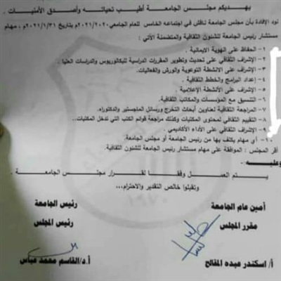 وأصدر رئيس جامعة صنعاء أكبر جامعات البلاد قرارا نص على منح المشرف الثقافي فايز البطاح صلاحية الحفاظ على الهوية الإيمانية والتي تعني التوجه الطائفي المتطرف للميليشيا والإشراف على تطوير وتحديث المقررات الدراسية في مراحل البكالوريوس والماجستير والدكتوراه، مع العلم أنه لا يحمل سوى شهادة البكالوريوس، فضلا عن ضرورة موافقته الثقافية أساساً لقبول رسائل الماجستير والدكتوراه إلى جانب الإشراف على الأنشطة الثقافية والإعلامية.