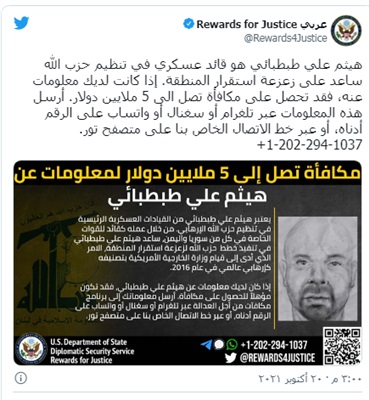 وقال برنامج مكافآت من أجل العدالة التابع للخارجية الأمريكية، في إعلان نشره عبر حسابه في "تويتر" الأربعاء 20 أكتوبر، إن "هيثم علي طبطبائي يعتبر من القيادات العسكرية الرئيسية في تنظيم حزب الله الإرهابي من خلال عمله كقائد للقوات الخاصة في اليمن وسوريا".