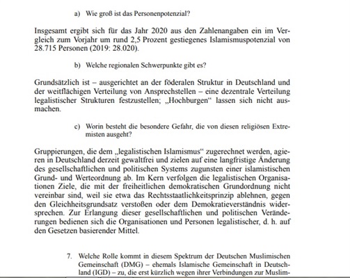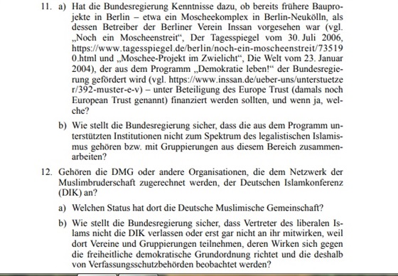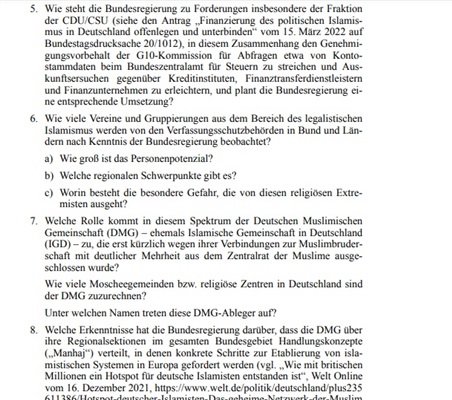 ويري الحزب أن الحكومة عليها تقديم ما لديها من معلومات بخصوص الجمعيات الإسلامية التى تنشط فى الولايات الألمانية، وما هى الخطوات التى تتخذها الحكومة وفقا للمعلومات المقدمة من المكتب الاتحادى لحماية الدستور " جهاز الاستخبارات الداخلية فى ألمانيا، وهل يتم التعامل بجدية مع ما يتم رصده من مخاطر أم لا