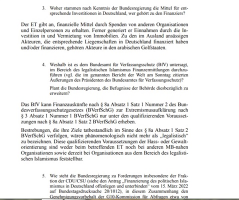 ما هي النتائج التي توصلت إليها الحكومة الفيدرالية بشأن "صندوق أوروبا"؟، كيف يتم دمج هذا الأساس في الهياكل الأوروبية للإخوان المسلمين؟، وما هو الدور الذي تلعبه ألمانيا في هذه الشبكة؟، وما هي العقارات وأسعار الشراء التي يمتلكها "صندوق أوروبا"، وهل تعلم الحكومة الفدرالية ما يحدث؟، ومن أين تأتي الأموال المخصصة للاستثمارات المقابلة في ألمانيا ، ومن هم الممولين؟