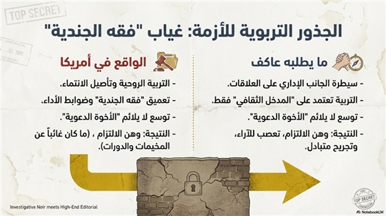 الملاحظة هنا أن الرجل يعالج مشكلةً تدور فصولها في أمريكا، بلد الحريات والنقاش الحر، فيُعلي من قيم الجندية، وينصح باعتماد رسائل البنا كأساسٍ دون غيرها، في انفصالٍ كاملٍ عن الواقع، أدى في الحقيقة – وليس في أمريكا فقط، ولكن في كل أوروبا والغرب عمومًا – إلى أن تحوّل الإخوان، وحوّلوا الإسلام والمسلمين، إلى مجموعةٍ من الانفصاليين، يتم استخدامهم وقت الحاجة إليهم كفزاعة، سواء للحكام العرب أو للمجتمعات الغربية على حدٍّ سواء.