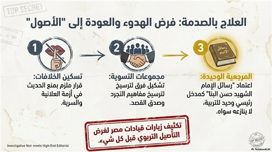 وعلى مستوى الحلول، يقترح عاكف أن العمل السريع يقتضي قرارًا حاسمًا وملزمًا يفرض “تسكين الخلافات”، وعدم السماح بتحولها إلى حديثٍ دائم، مع تشكيل مجموعة تسوية تنشط في ترسيخ مفاهيم فقه الدعوة، وتعميق قيم الجندية والحب والأخوة والتجرد وصدق القصد، على أن تكون “رسائل الإمام الشهيد” مدخلًا رئيسيًا للتربية والتوجيه، وأساسًا لا ينازعه سواه.