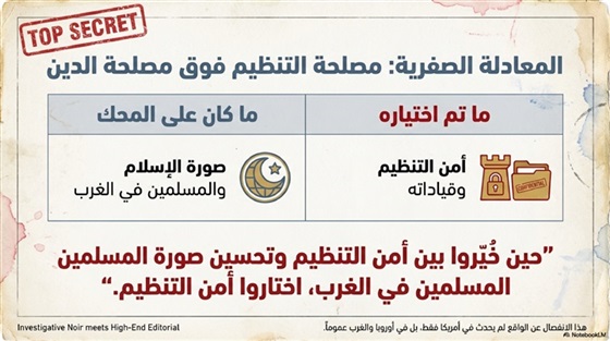 • لماذا كانوا ينكرون دائمًا أن مصلحة التنظيم تأتي دائمًا قبل مصلحة الوطن، وهم حين خُيّروا بين أمن التنظيم وتحسين صورة المسلمين في الغرب، اختاروا أمن التنظيم، في إعلاءٍ واضحٍ لمصلحة التنظيم على أي اعتبارات أخرى، حتى لو كانت صورة الإسلام والمسلمين في الغرب؟