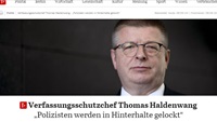 تتواصل السلطات الألمانية ملاحقة عناصر اليمين المتطرف منعا لتأثير نفوذه السلبي على المجتمع الألمانى، وهو ما قد يكون له تبعياته خلال الحملات الانتخابية القادمة، فى الوقت الذى يواصل فيه مكتب حماية الدستور "جهاز الاستخبارات الداخلية" رصد تحركات الجماعات المتطرفة وخاصة أنصار حزب "البديل من أجل المانيا"، المزيد ».