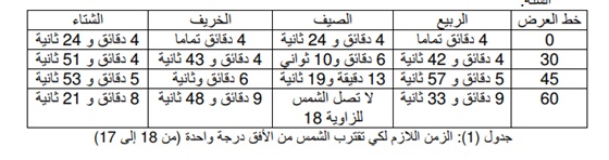 كما أنه لا يصح حساب موعد صلاة الفجر بالمقارنة بموعد صلاة دولة أخرى حتى بحساب الفارق الزمني، 4 دقائق لكل خط طول؛ إذ يؤكد الفلكيون أن هذه القاعدة المشهورة تصح في حال وقوع المدينتين على دائرة عرض واحدة عند خط الاستواء، وقد ذكر المهندس محمد شوكت عودة، مدير مركز الفلك الدولي بأبوظبي، في بحث له بعنوان «إشكاليات فلكية وفقهية حول تحديد مواقيت الصلاة»، أن الزمن اللازم لكي تقترب الشمس من الأفق درجة واحدة من الزاوية 18 إلى الزاوية 17، تختلف وفق الفصول الأربعة وخط العرض -وفق ما هو موضح بالجدول المرفق- بما يعني خطأ الاعتماد على الحسابات الرياضية في تحديد موعد صلاة الفجر في بلد، مقارنة بأخرى.