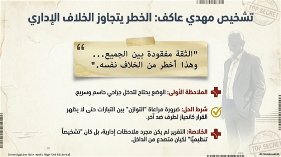 ثم يضع يده على جوهر الخطر: الثقة مفقودة بين الجميع، وهذا – من وجهة نظره – أخطرُ من الخلاف نفسه.