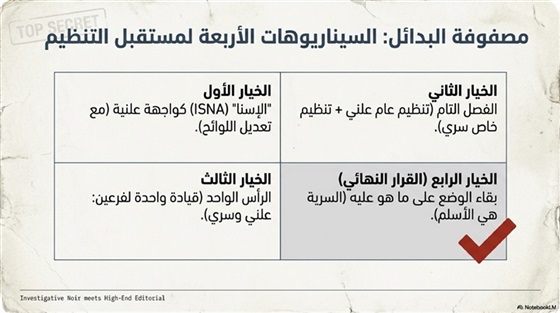 • صعوبة الجمع بين إخوة يعملون بشكلٍ سريٍّ وآخرين يعملون بشكلٍ علني في تنظيمٍ واحد.