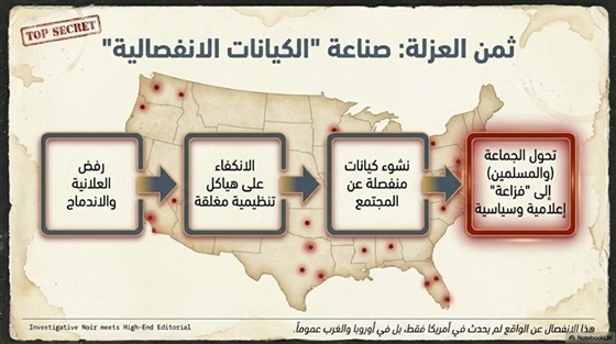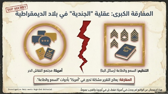 الملاحظة هنا أن الرجل يعالج مشكلةً تدور فصولها في أمريكا، بلد الحريات والنقاش الحر، فيُعلي من قيم الجندية، وينصح باعتماد رسائل البنا كأساسٍ دون غيرها، في انفصالٍ كاملٍ عن الواقع، أدى في الحقيقة – وليس في أمريكا فقط، ولكن في كل أوروبا والغرب عمومًا – إلى أن تحوّل الإخوان، وحوّلوا الإسلام والمسلمين، إلى مجموعةٍ من الانفصاليين، يتم استخدامهم وقت الحاجة إليهم كفزاعة، سواء للحكام العرب أو للمجتمعات الغربية على حدٍّ سواء.