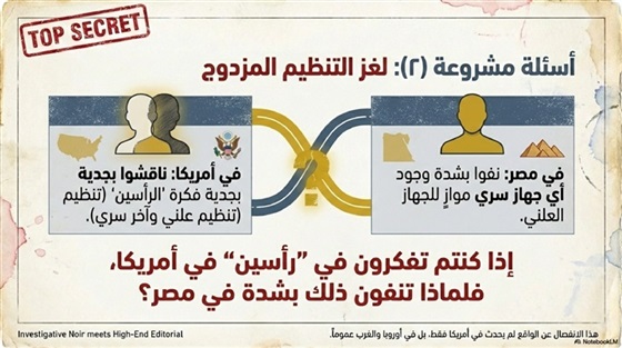 • إذا كانوا يفكرون في تنظيمٍ برأسين (علني/سري) في أمريكا، فلماذا كانوا ينفون وجود تنظيمين في مصر، أحدهما علني والآخر سري؟