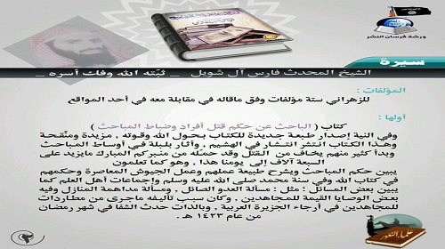 1- كتاب "الباحث عن حكم قتل أفراد وضباط المباحث"، وهو أول كتاب يكتب عليه اسمه صراحة، وصدر بعد المواجهات بين جماعات "القاعدة" والسلطات السعودية، عقب حادثة مواجهة استراحة حي الشفا جنوب غربي الرياض صباح 16 نوفمبر 2002م، وكان الكتاب مسوغاً لقتل الضباط، وقد قال ذلك بوضوح في مقدمة الكتاب.