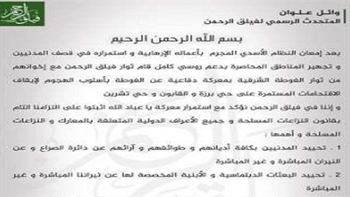 وأصدر "فيلق الرحمن" المنضوي في صفوف الجيش السوري الحر، بياناً شدد من خلاله أنه الالتزام بتحييد المدنيين بكافة طوائفهم وانتماءاتهم والبعثات الدبلوماسية ودور العبادة والقائمين عليها، عن المعارك والنيران المباشرة وغير المباشرة.