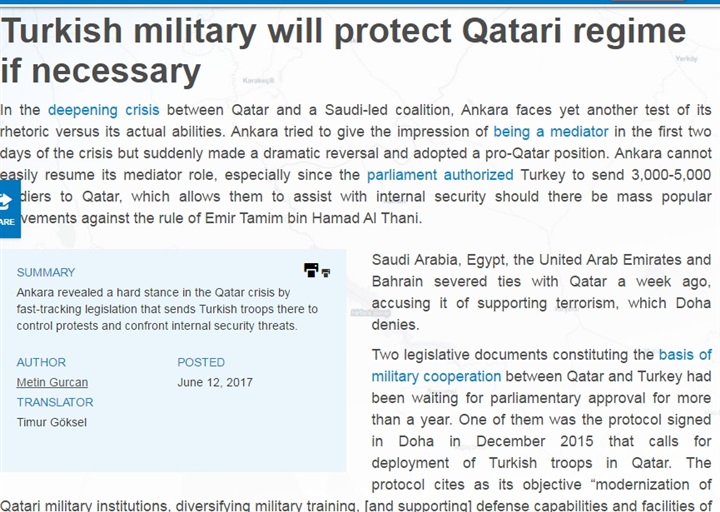 ركزت الصيحفة على أن الحملة التي تقودها السعودية لعزل قطر من خلال قطع العلاقات الدبلوماسية والتجارية مع الدوحة أدت إلى توقف واردات الغذاء من نقاط عبور رئيسية في السعودية والإمارات وأحدثت حالة من التزاحم على الشراء أوائل هذا الأسبوع، وكان من شأن ذلك الشقاق أن اضطر البلد الصغير الذي كان يستورد 80 بالمائة من احتياجاته الغذائية من جيرانه الخليجين، إلى التماس سبيله صوب دول أخرى مصدرة من بينها تركيا وإيران، بيد أنه لجأ أيضا إلى شركات الأغذية المحلية لإمداد المتاجر بما يكفيها من السلع.