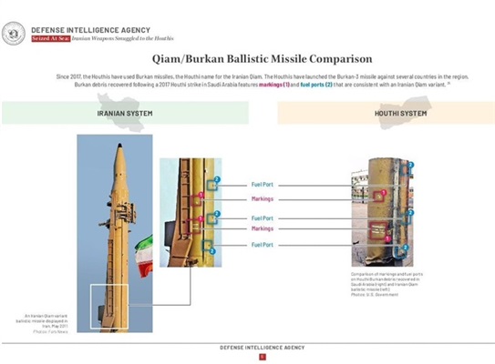 وقدم التقرير الصادر عن وكالة الاستخبارات الدفاعية الأمريكية (DIA)، الأربعاء 10 يوليو، تحت عنوان "ضبط في البحر: أسلحة إيرانية مهربة إلى الحوثيين"، مقارنة مرئية بين الأسلحة الإيرانية ومكونات الأسلحة التي تم اعتراضها أثناء نقلها إلى الحوثيين في اليمن في 11 و28 يناير.